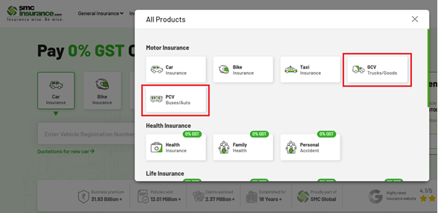 You can visit SMC insurance website and click on the “View All” option. Mention if you own a GCV or PCV and provide some other necessary details like your vehicle registration number, model, etc. You will be directly taken to the page where you can compare policies from different insurers and choose the best one for your vehicle.