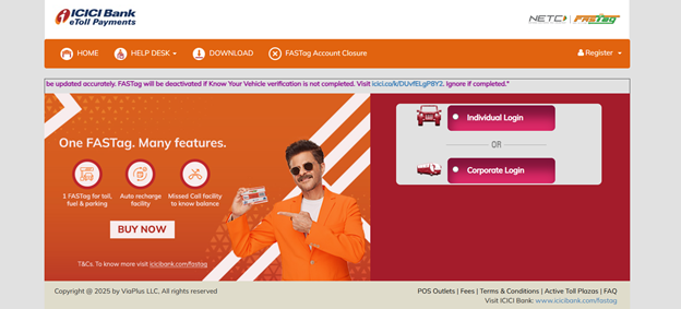 - Through the iMobile Pay app, by logging in and navigating to the FASTag section under “Manage Tags” or by visiting the ICICI FASTag website and signing in with your credentials.